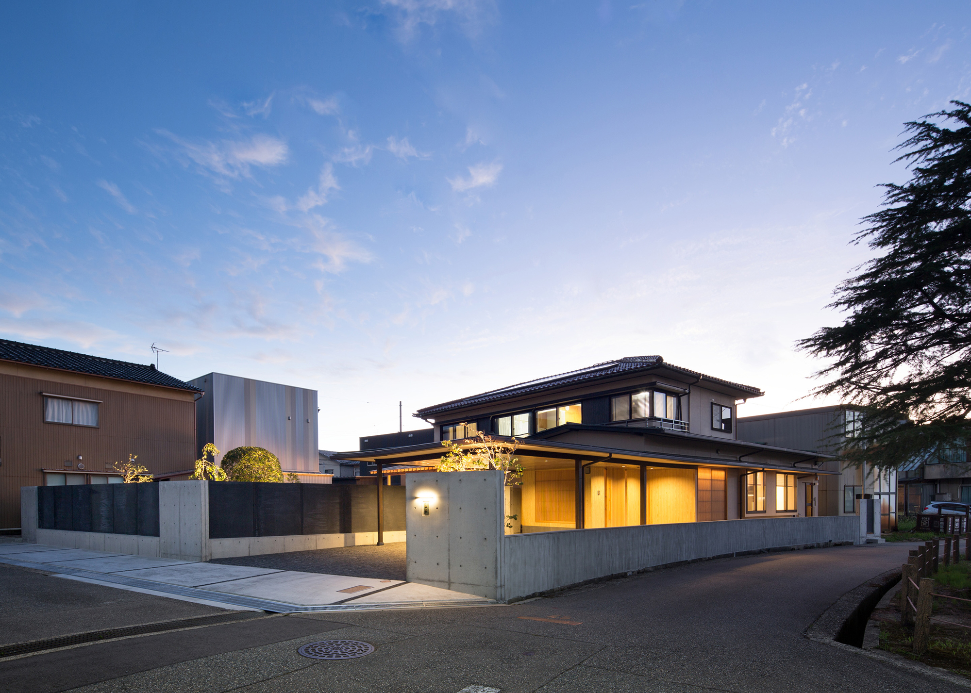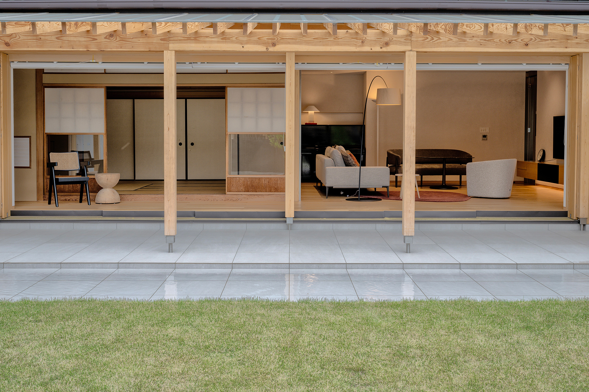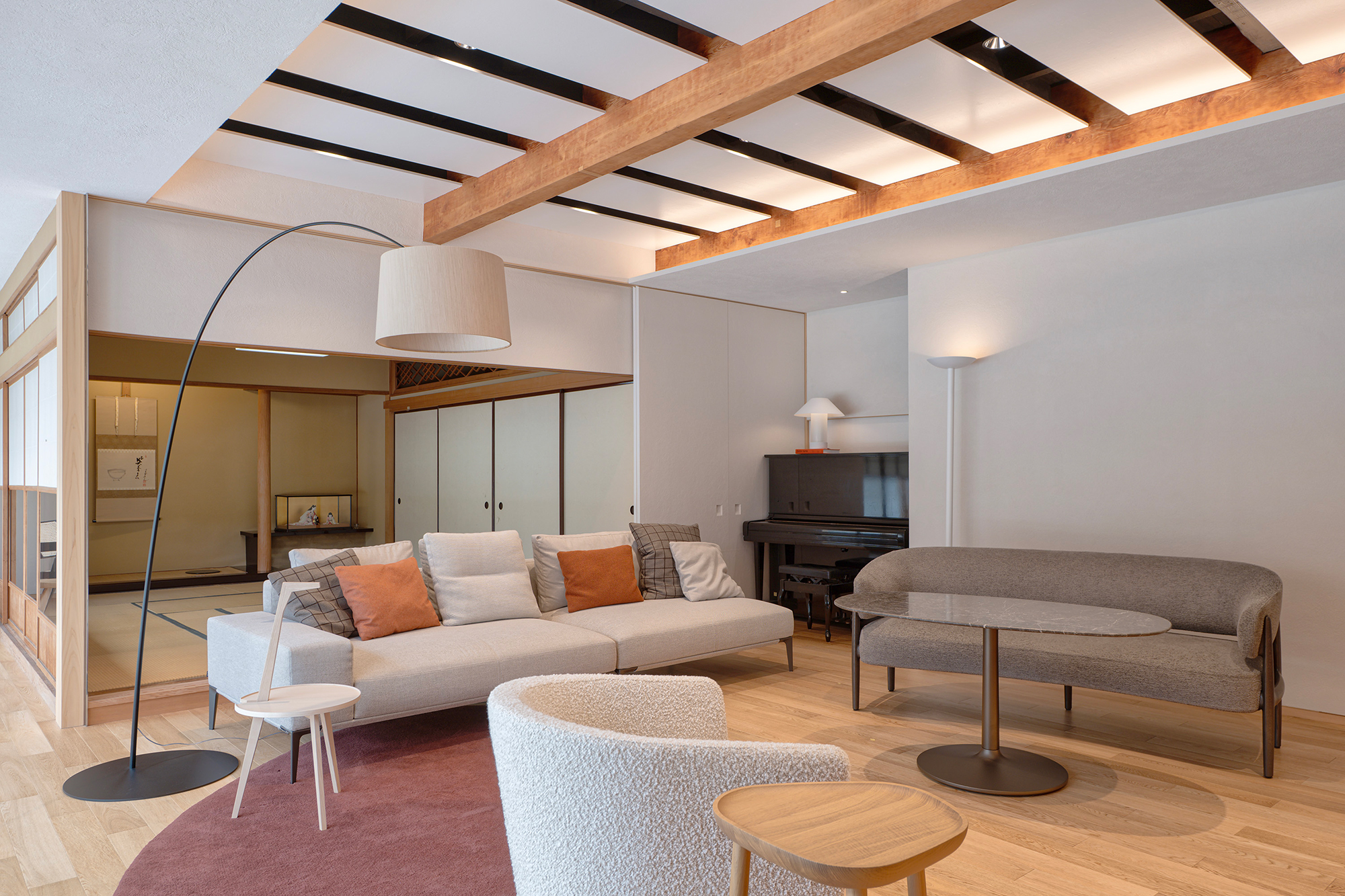 This project renovates a 60-year-old traditional Japanese house, preserving its original columns and beams while introducing ceiling slits and ivory-toned walls to create a lighter atmosphere. Views of the garden beyond the engawa strengthen the connection between indoors and outdoors, balancing historic character with modern living.