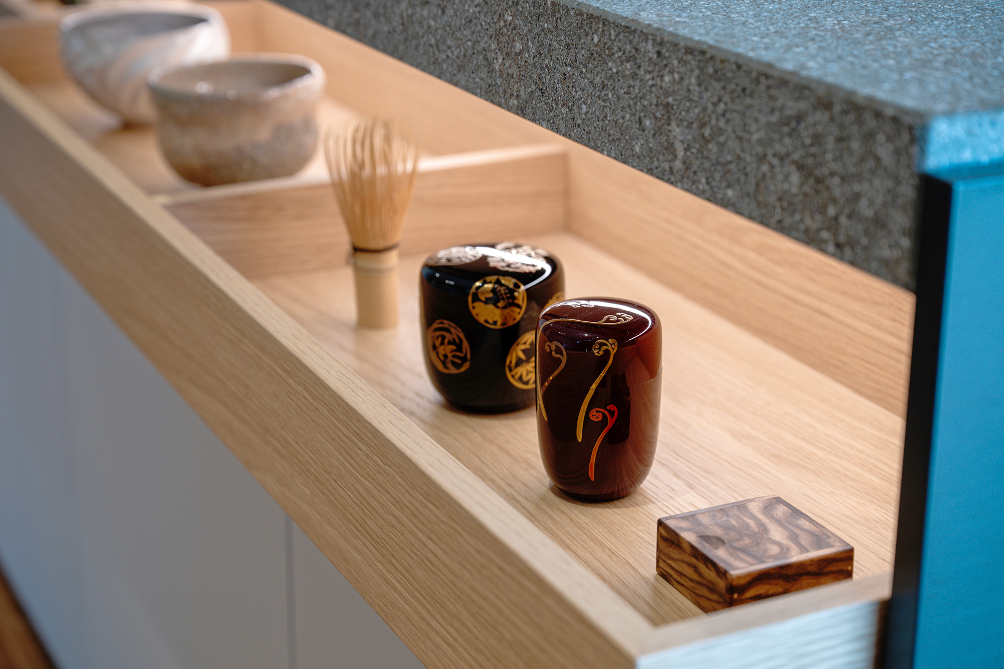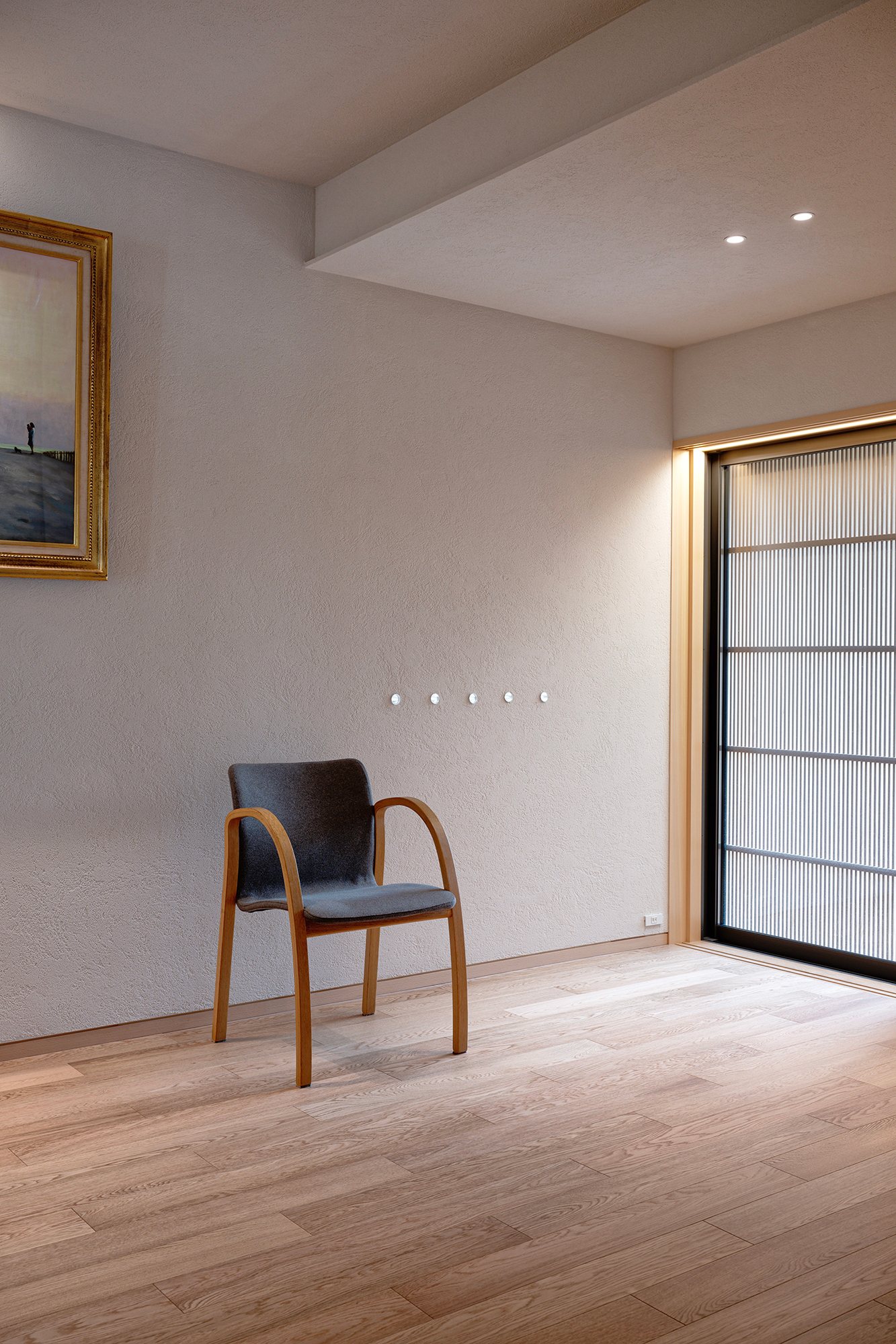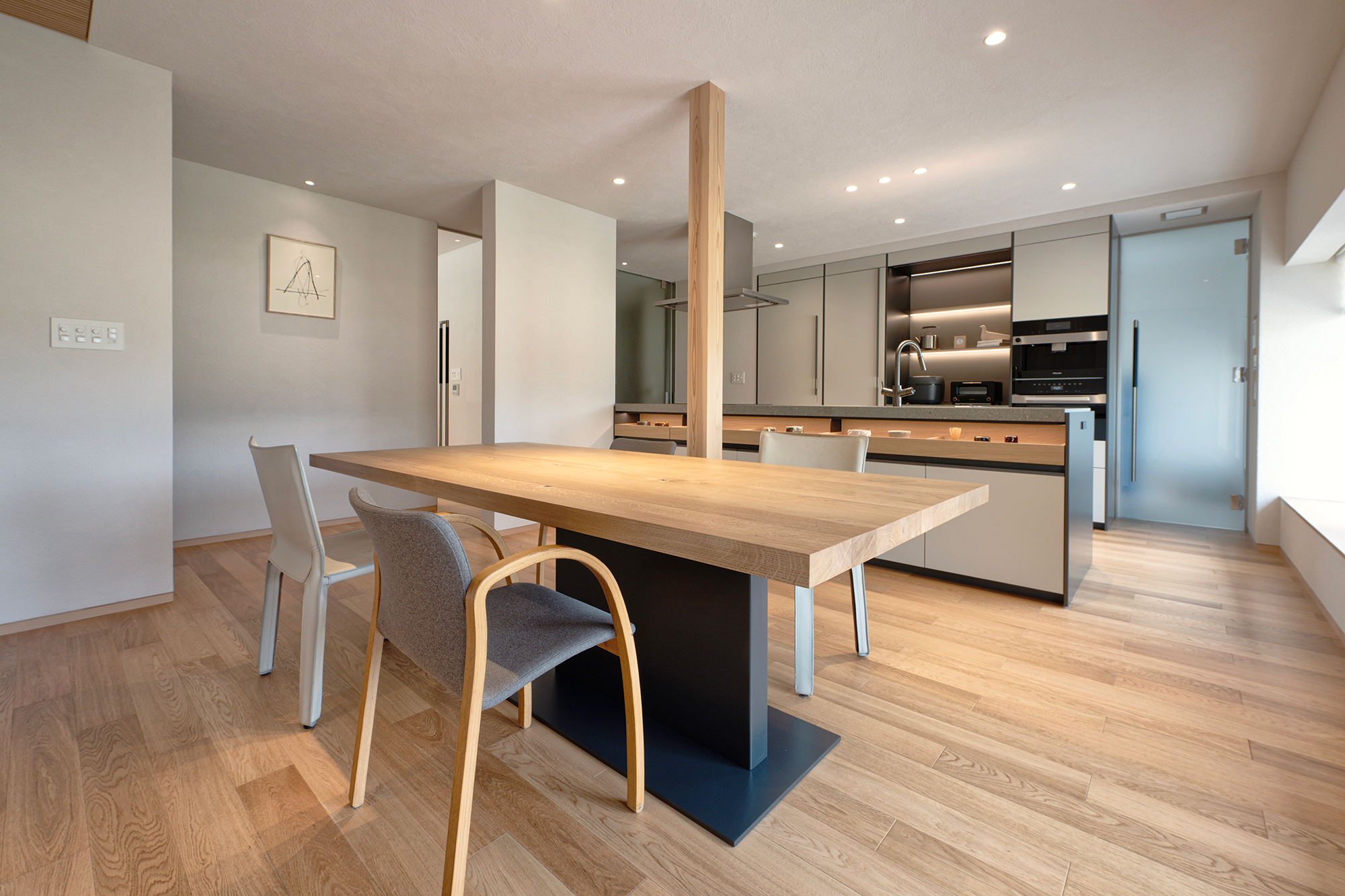 The light-filled living area offers multiple ways to relax, complemented by natural materials and soft lighting in the dining kitchen. At the entrance, cherished artwork and a chair used by the mother for over 40 years quietly reflect the home’s family history.